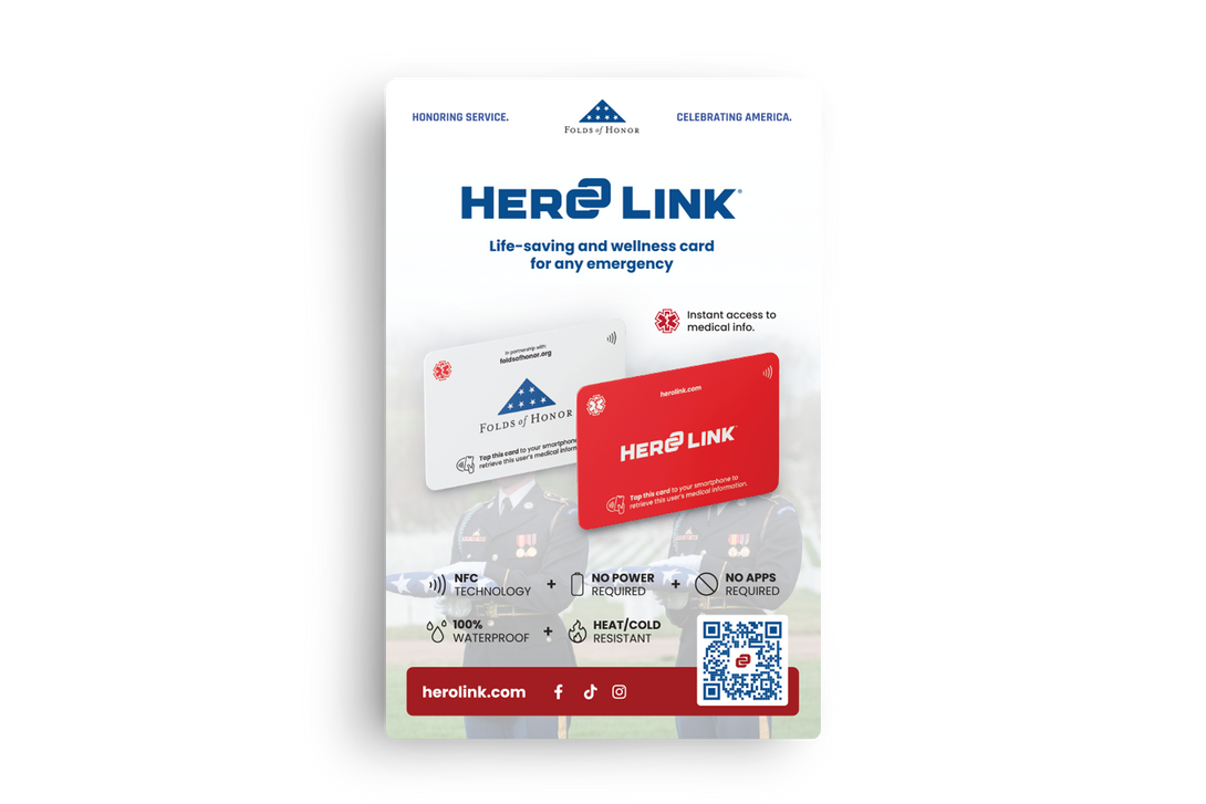 If you’re ever unconscious or unable to speak, rescuers searching for identification will immediately spot the card’s bright red design and clear, bold instructions. With a quick tap from any NFC-enabled smartphone, they’ll instantly access your secure Hero Link® profile—containing your vital medical information, emergency contacts, and other critical details.