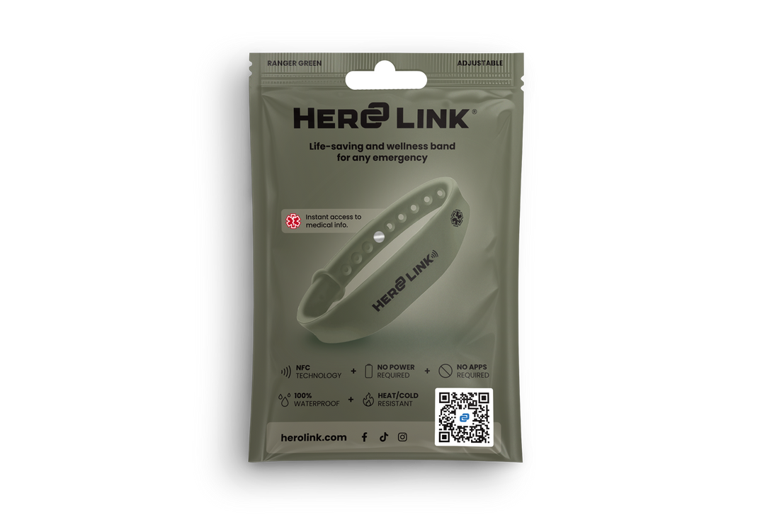 Wear your lifeline on your wrist—ready for action wherever you go. The Hero Link® adjustable silicone band combines rugged durability with instant, tap-and-go emergency access to your vital information.